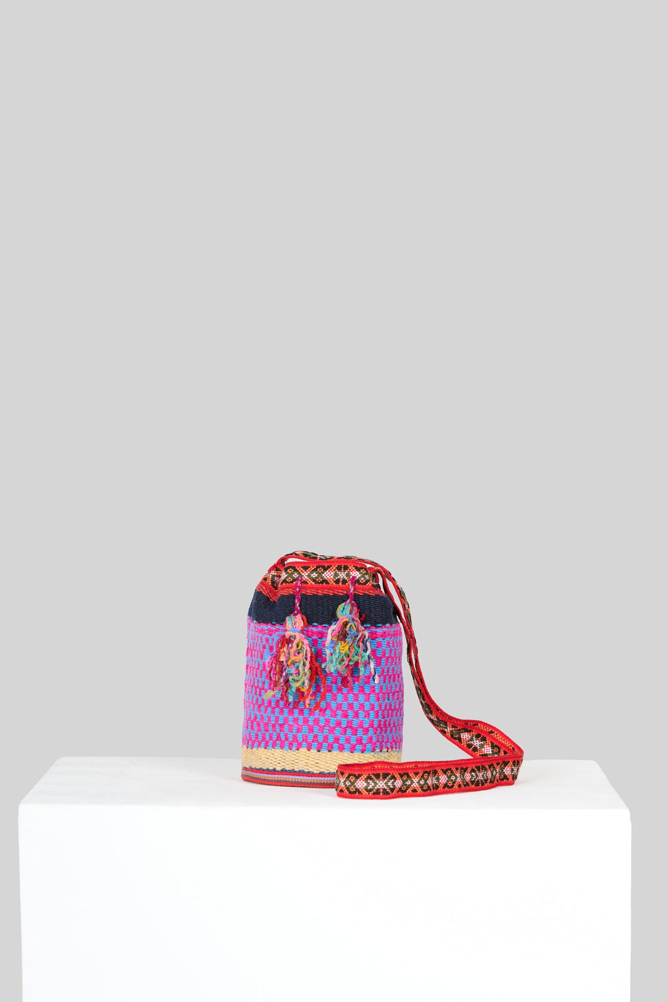 Secchiello in lana multicolor con fascia navy blue, interamente realizzato a mano dalle donne artigiane del Perù, specificamente della regione del Cuzco.