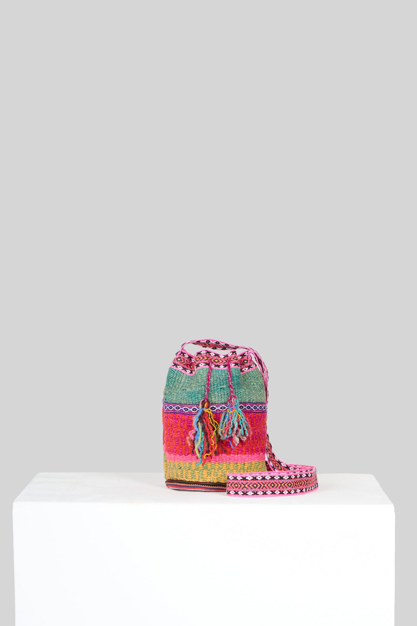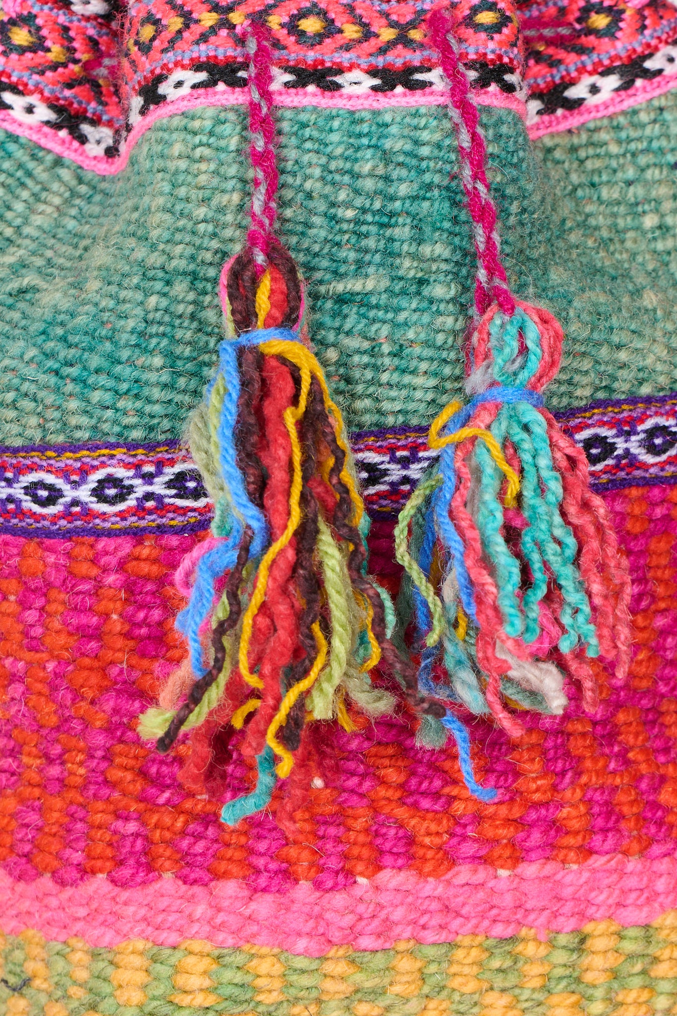 Secchiello in lana multicolor con fascia verde, interamente realizzato a mano dalle donne artigiane del Perù, specificamente della regione del Cuzco.