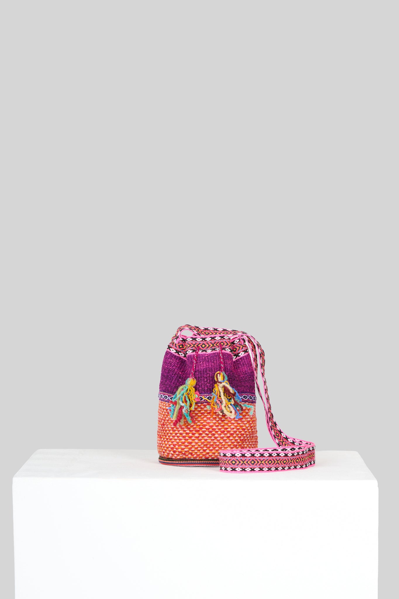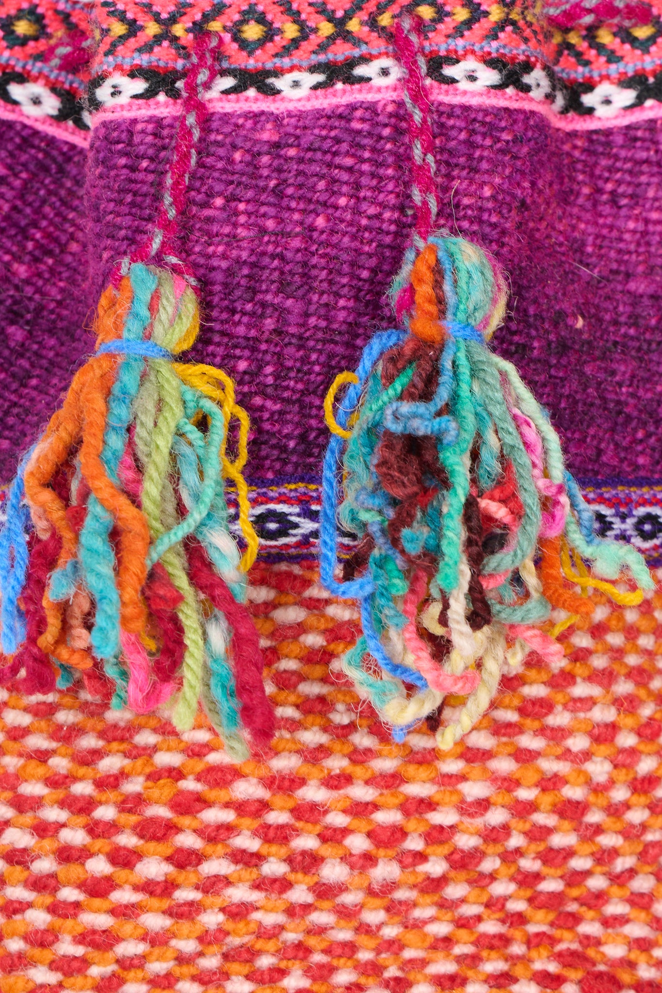 Secchiello in lana multicolor con fascia viola, interamente realizzato a mano dalle donne artigiane del Perù, specificamente della regione del Cuzco.